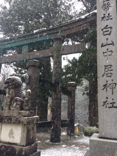 名古屋でレンタカーを借りて岐阜へと向かっていたのですが、白山中居神社が近づくにつれて雪が降ってきました。